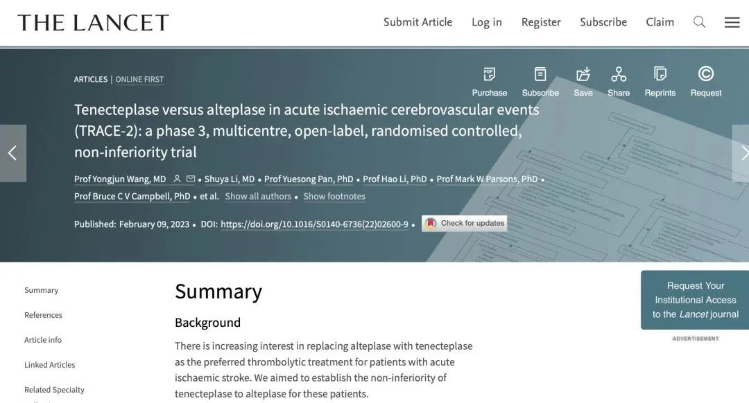 由石藥集團明復樂藥業(廣州)有限公司發起,首都醫科大學附屬北京天壇醫院王擁軍教授領銜,針對石藥集團明復樂藥業創新藥銘復樂®(注射用重組人TNK組織型纖溶酶原激活劑,rhTNK-tPA)開展的TRACE系列研究再次獲得重磅認可。2月9日,其中的TRACE-2研究成果在國際頂級權威醫學雜志《柳葉刀》(The Lancet)(IF:202.731)發表。這是我國企業自主知識產權的腦血管病藥物首次登上全球頂刊,標志著神經領域國產藥物注冊臨床研究成果開始走上國際舞臺。