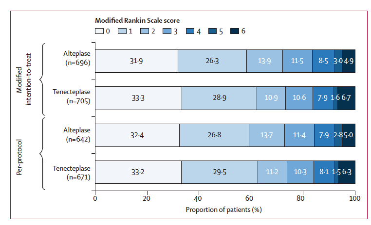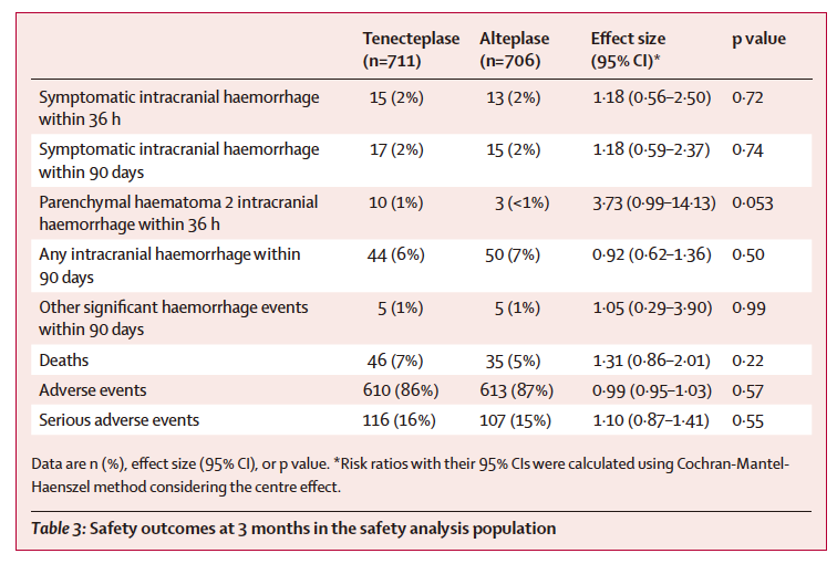 試驗結果顯示,rhTNK-tPA治療組獲得良好功能預后的(90天mRS評分0-1分)受試者比例為62%,rt-PA治療組為58%, 兩組差值達到非劣效。rhTNK-tPA治療組36小時內PH2型顱內出血,90天內癥狀性顱內出血及死亡患者的比例與rt-PA治療組相比無統計學差異。
