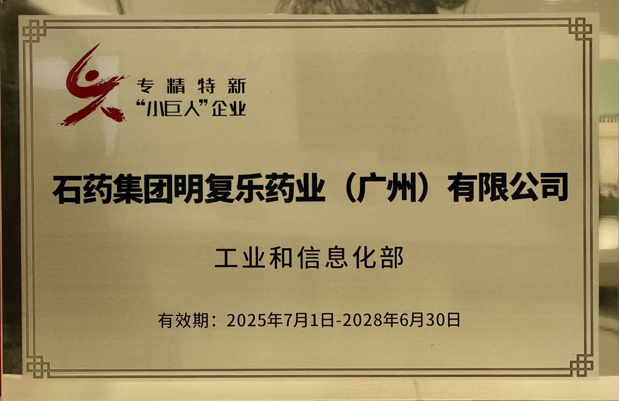 2025年10月,石藥集團明復樂藥業(廣州)有限公司成功通過國家工業和信息化部認定,榮獲國家專精特新“小巨人”企業稱號,標志著公司在技術創新、市場表現及行業影響力等方面的卓越成就獲得國家級的高度認可和充分肯定,將有利于擴大公司品牌影響力,助推企業高質量高速度發展。
